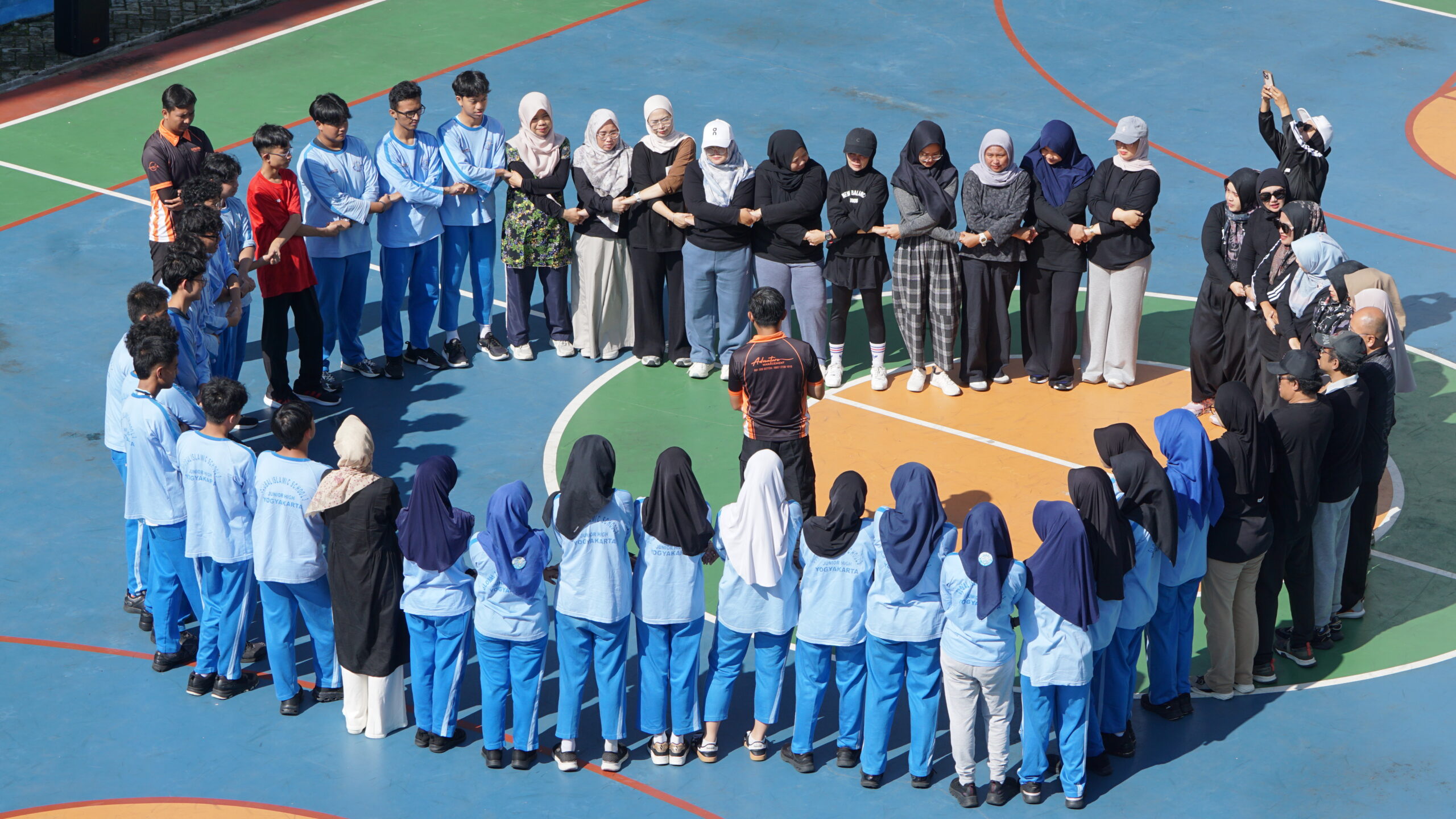 Setelah membangkitkan semangat di aula, trainer mengajak seluruh peserta ke lapangan. Di bawah terik sinar matahari pagi itu, mereka bergandengan tangan dan diberi suatu tantangan yang menguji kekompakan, kemampuan problem solving, dan koordinasi.